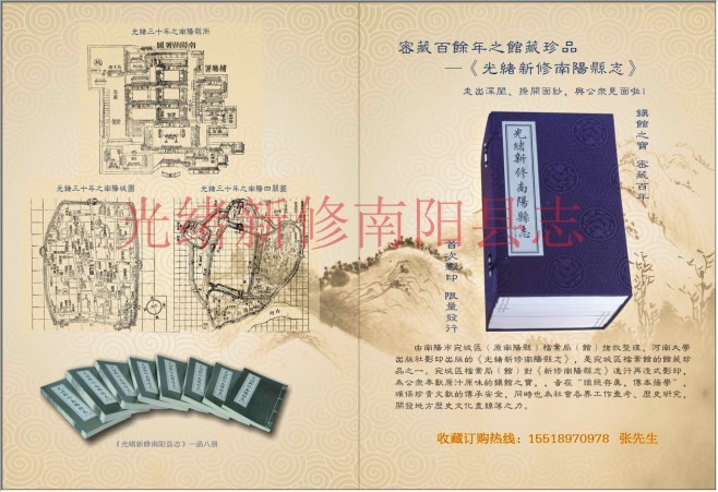 据资料介绍:(南阳)县故无志,明万历中,知县成逊与教谕宋昂创为之。邑人方九功(万历十七年进士,南阳县人,官至南京吏部右侍郎),称其事核体简。清康熙三十年,知县张光祖,因前令李本深所纂旧志,以属诸生宋景愈等,重共搜辑,成书六卷,书颇疏陋。自是以后,无赓续为之者。同治十三年,吴若烺知县事,始与教授宋君合议重修,甫开局而吴君去。迄光绪二十五年,知县潘公守廉复设局重修,历时6载,成书十二卷首一卷,名为《新修南阳县志》,书稿呈报时任河南巡抚贵阳陈夔龙,陈公披览是书,叹其深稽详考、用力宏深、文章尔雅、斐然可观,欣然为之序,于光绪三十年刊刻问世。